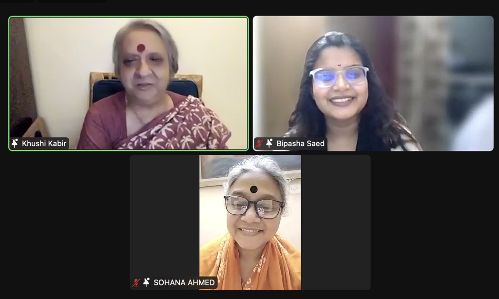 The event concluded with a ‘solidarity song’ written by the iconic South Asian feminist Kamla Bhasin, Tumhara sath milne se (With your support), sung by three generations of Bangladeshi feminists led by the feminist activist Khushi Kabir, together with Sohanna Ahmed and Bipasha Saed.